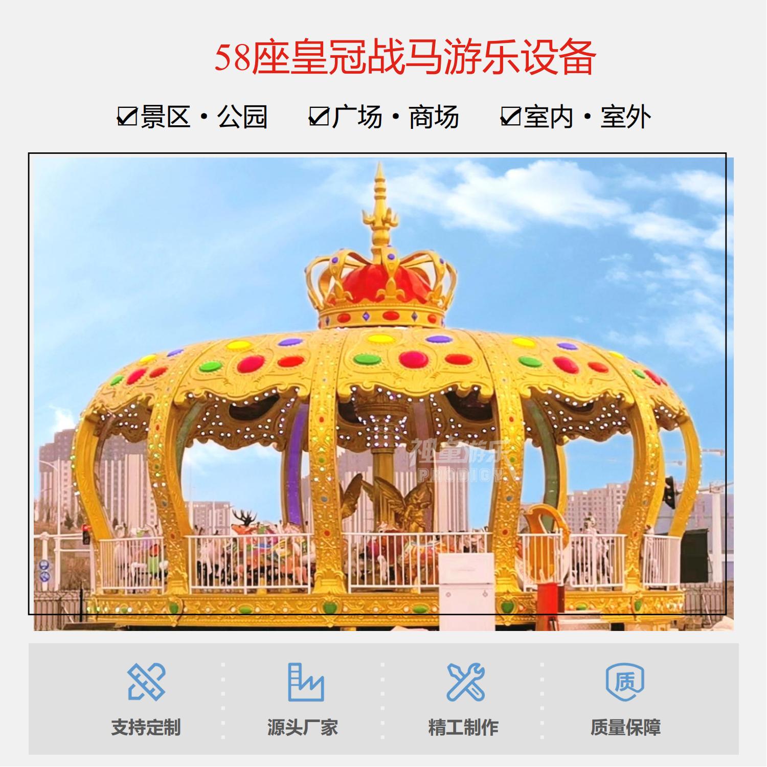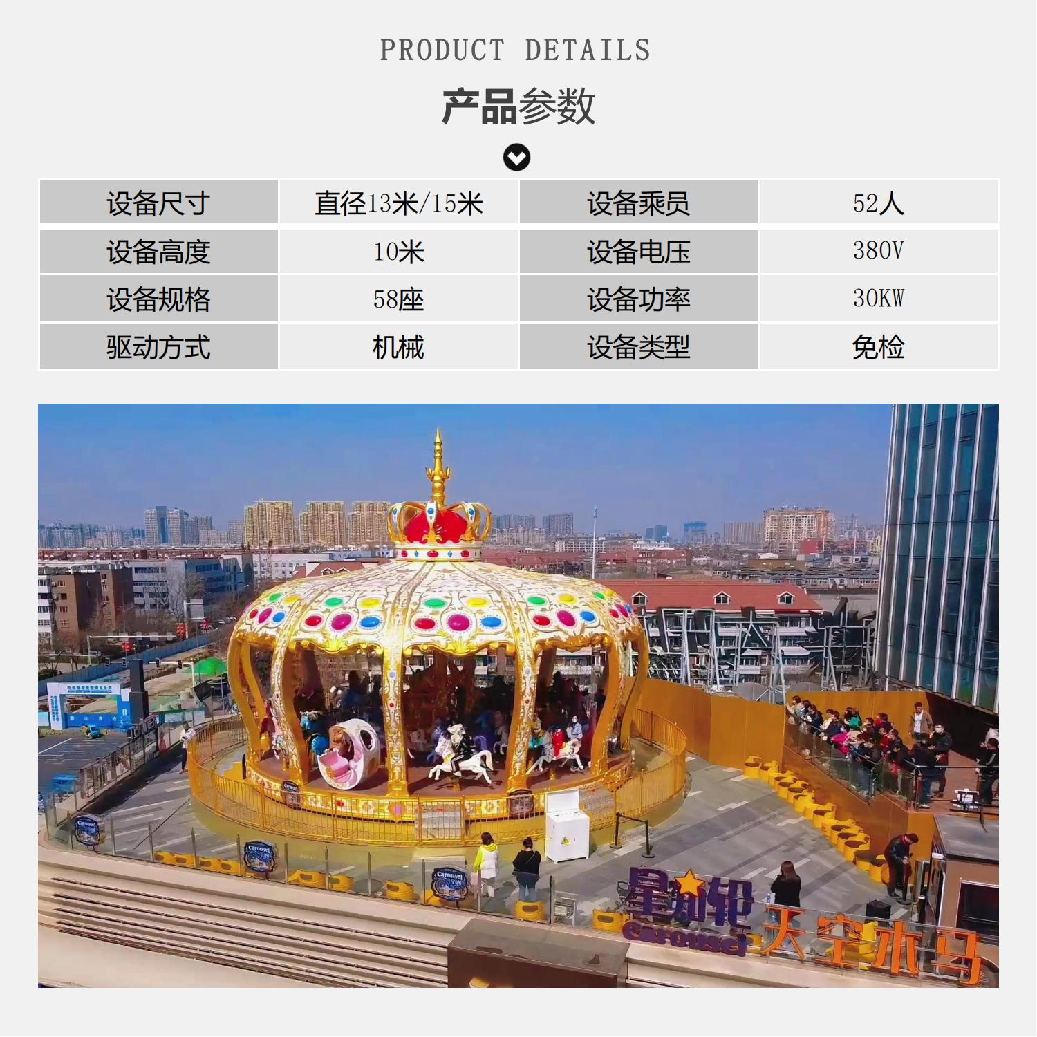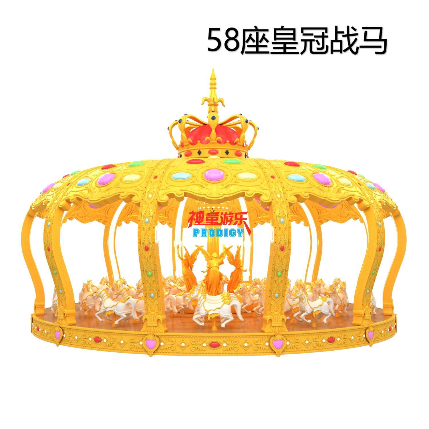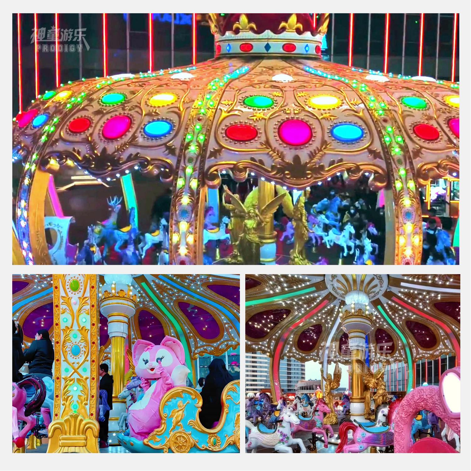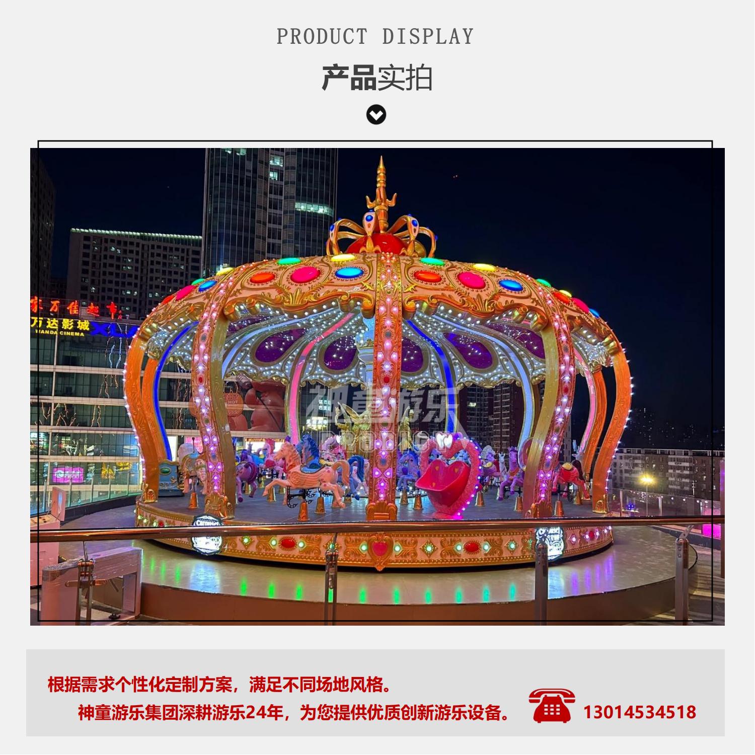 旋轉木馬是一種垂直軸類單轉體起伏型游藝機,是模擬跑馬廳的娛樂活動而設計的,該游藝機的上部設有彩色的錐形頂棚,頂棚的周圈裝有五彩繽紛的玻璃鋼裝飾板,更顯豪華氣派,儼如華麗的跑馬廳。戰馬奔騰,振奮人心,燈光絢麗,耀眼奪目!豪華工藝,精工制作。24K金工藝,前所未有的創意設計,隱忍注目的豪華造型。持續盈利的必選產品。