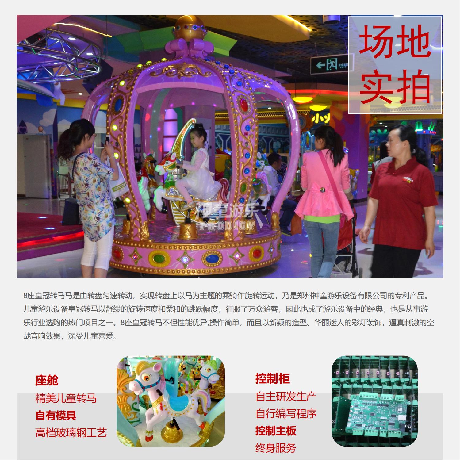 8座皇冠轉馬馬是由轉盤勻速轉動,實現轉盤上以馬為主題的乘騎作旋轉運動,乃是鄭州神童游樂設備有限公司的專利產品。兒童游樂設備皇冠轉馬以舒緩的旋轉速度和柔和的跳躍幅度,征服了萬眾游客,因此也成了游樂設備中的經典,也是從事游樂行業選購的熱門項目之一。8座皇冠轉馬不但性能優異,操作簡單,而且以新穎的造型、華麗迷人的彩燈裝飾,逼真刺激的空戰音響效果,深受兒童喜愛。