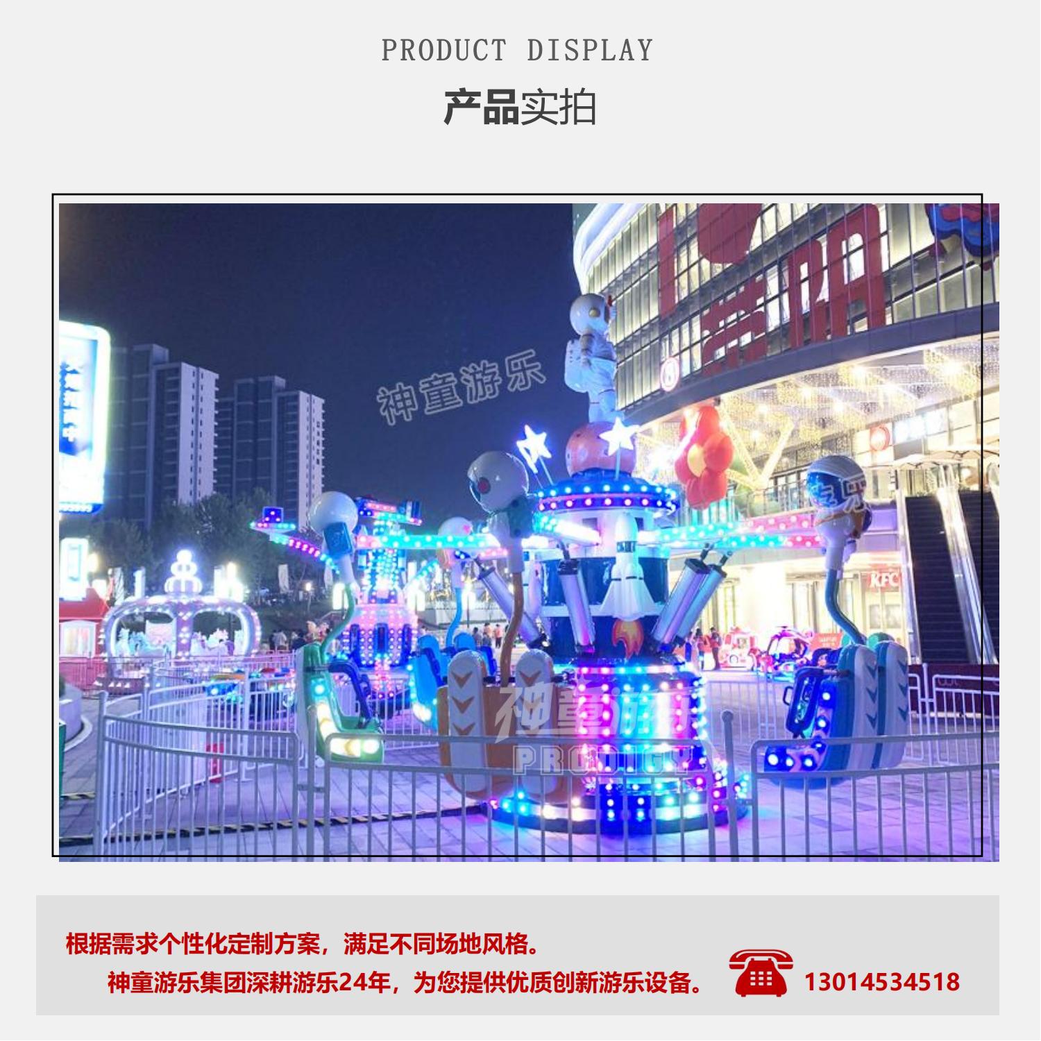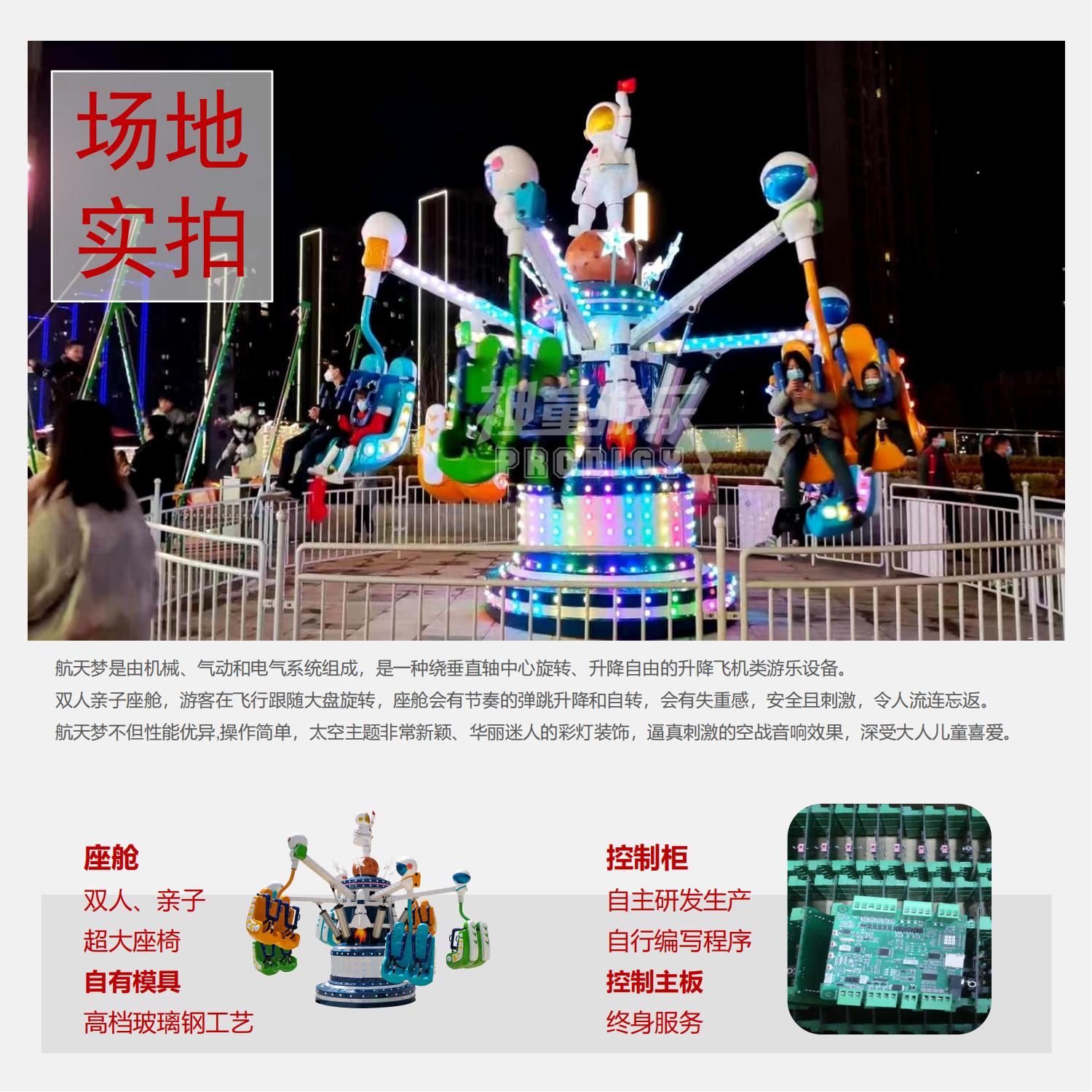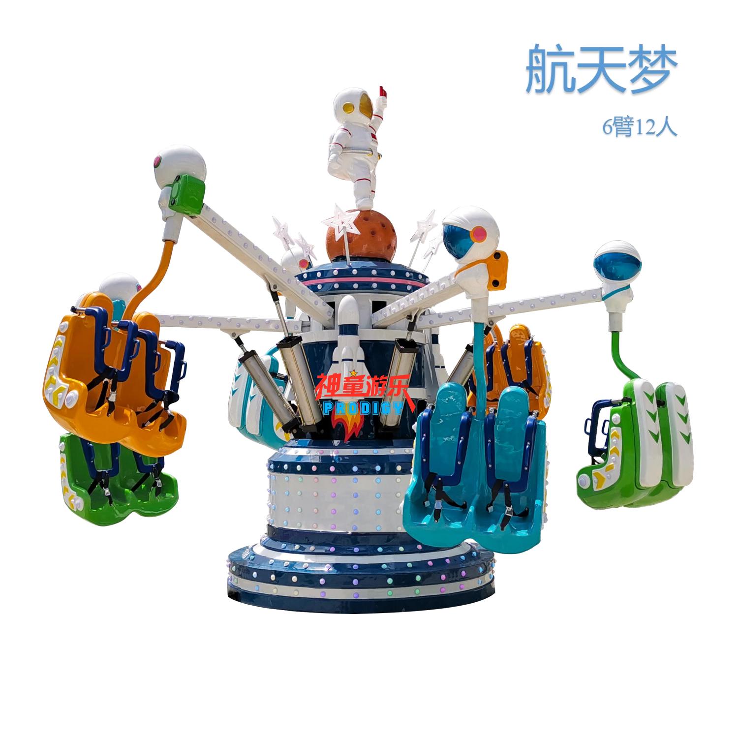 航天夢是由機械、氣動和電氣系統組成,是一種繞垂直軸中心旋轉、升降自由的升降飛機類游樂設備。 雙人親子座艙,游客在飛行跟隨大盤旋轉,座艙會有節奏的彈跳升降和自轉,會有失重感,安全且刺激,令人流連忘返。 航天夢不但性能優異,操作簡單,太空主題非常新穎、華麗迷人的彩燈裝飾,逼真刺激的空戰音響效果,深受大人兒童喜愛。