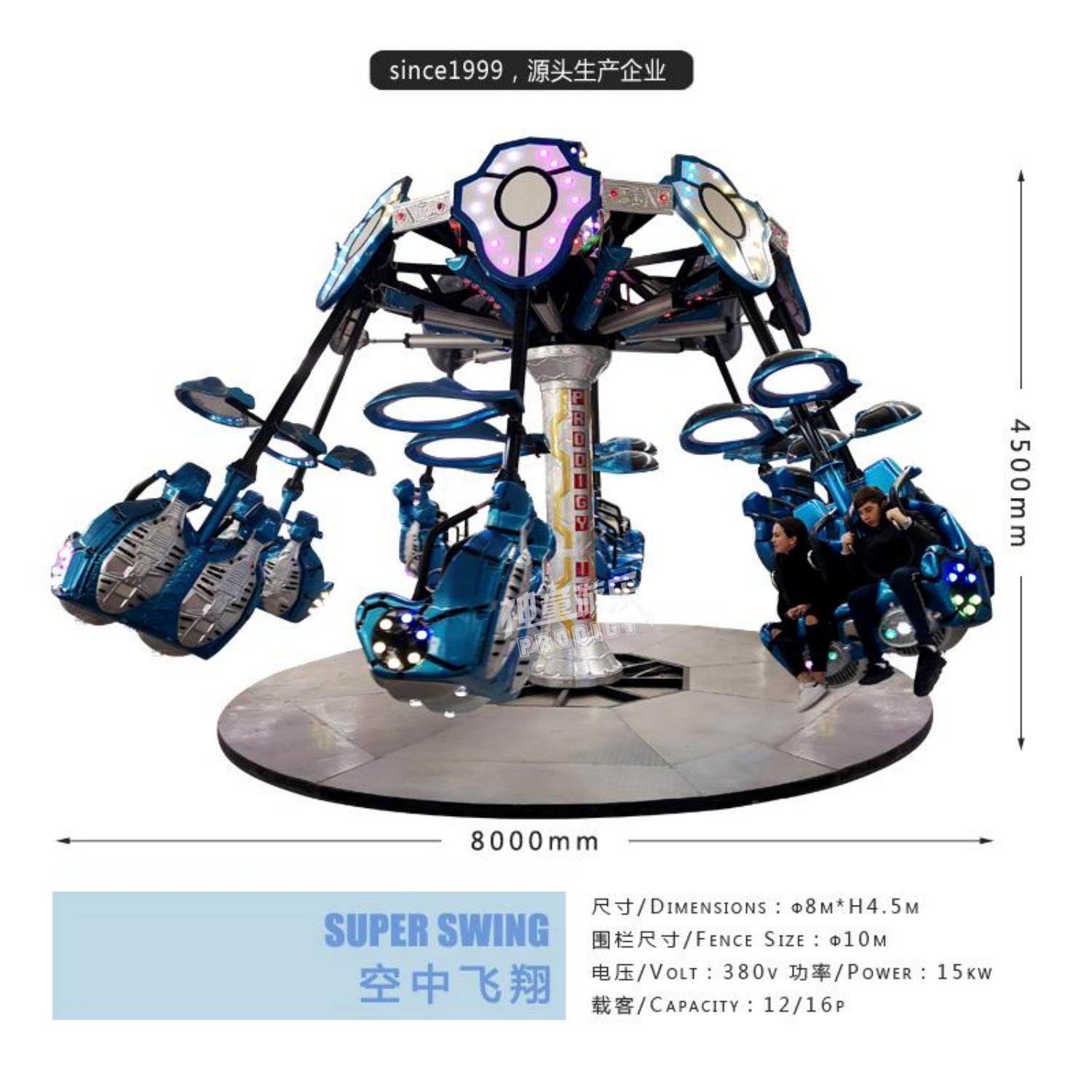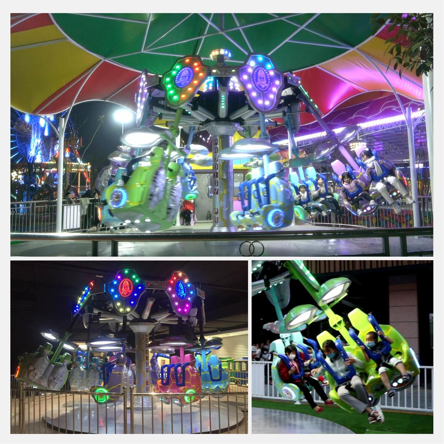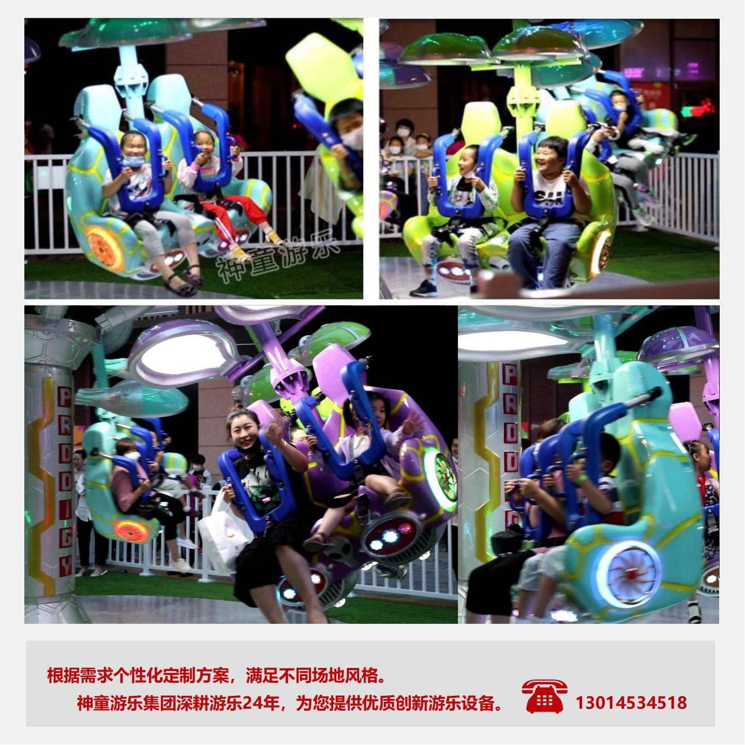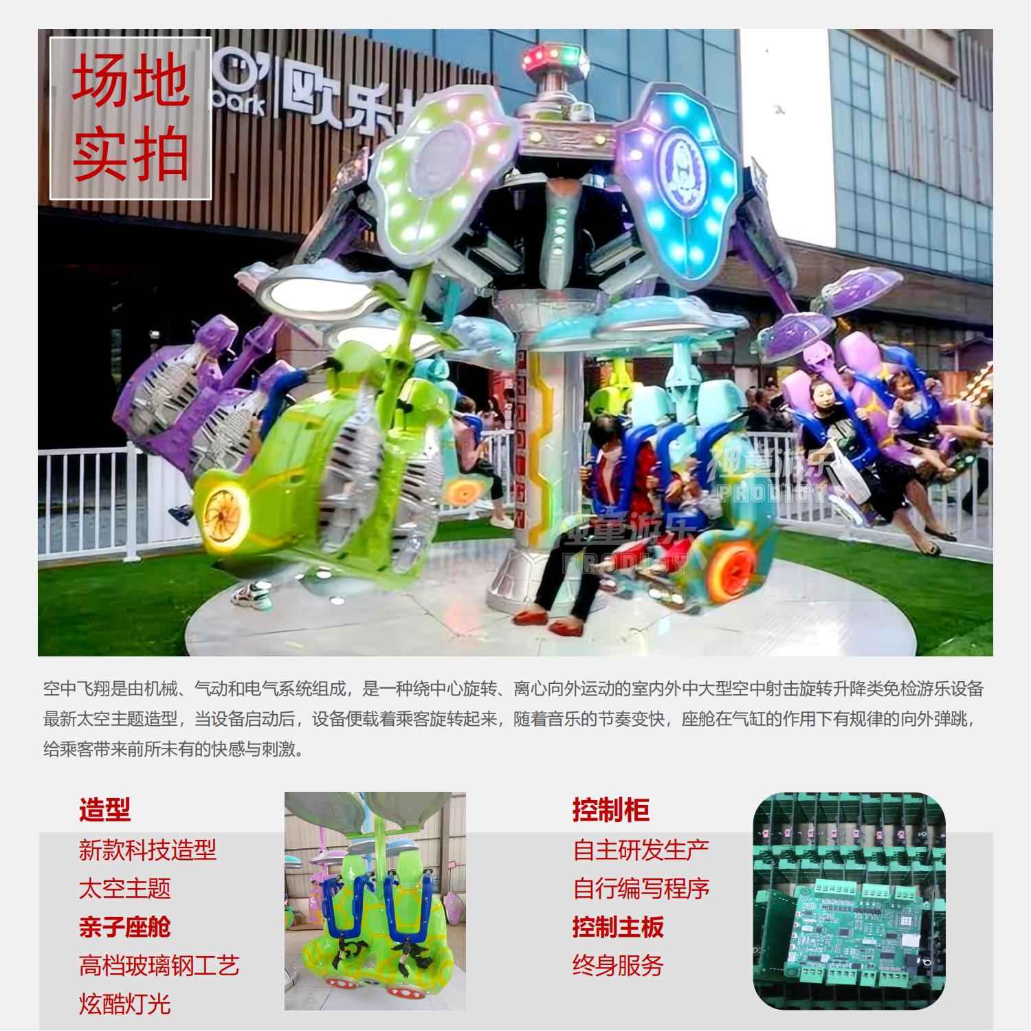 空中飛翔是由機械、氣動和電氣系統組成,是一種繞中心旋轉、離心向外運動的室內外中大型空中射擊旋轉升降類免檢游樂設備最新太空主題造型,當設備啟動后,設備便載著乘客旋轉起來,隨著音樂的節奏變快,座艙在氣缸的作用下有規律的向外彈跳,給乘客帶來前所未有的快感與刺激。