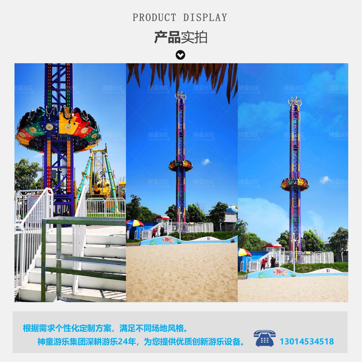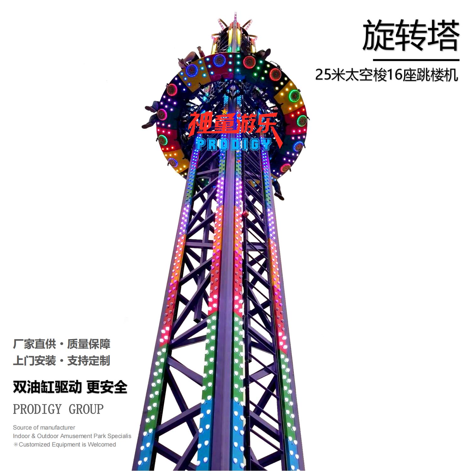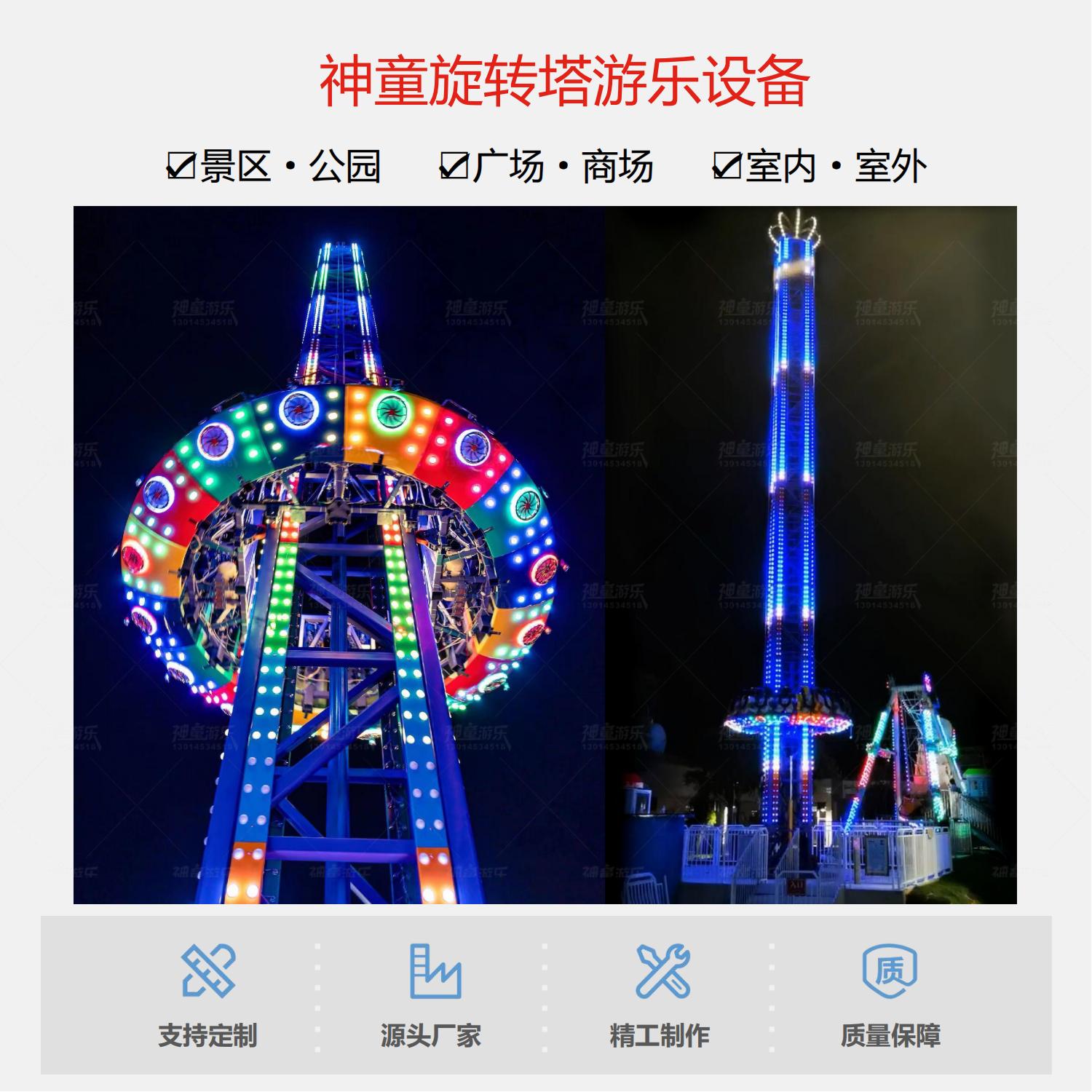 旋轉塔又叫旋轉太空梭、旋轉跳樓機,屬于飛行塔類游樂設備,其運行方式為座艙繞中心立柱旋轉,同時上升至頂部,隨后不定時突然快速下降,多次循環,帶給游客刺激感。旋轉塔是親子類標志性游樂設備。當夜晚來臨時,其高聳的塔身在游樂設備中更顯尊貴,五彩的燈光在隨乘客旋轉中猶如一道道彩虹,當空舞蹈,更顯絢麗奪目。動感的音效使游客身臨其境猶如在音樂的海洋中旋轉跳躍。